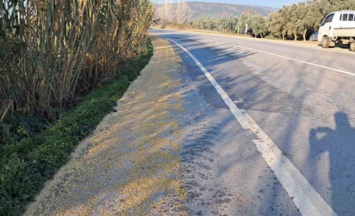 Bursa’nın İznik ilçesinde kamyonun kasasındaki çuvallardan dökülen soya fasulyeleri, kilometrelerce yola saçıldı.