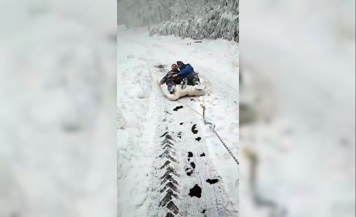 Sakarya’nın Akyazı ilçesinde 2 kişinin traktörün arkasına bağladıkları yatakla karda kaydığı anlar cep telefonu kamerasına yansıdı.