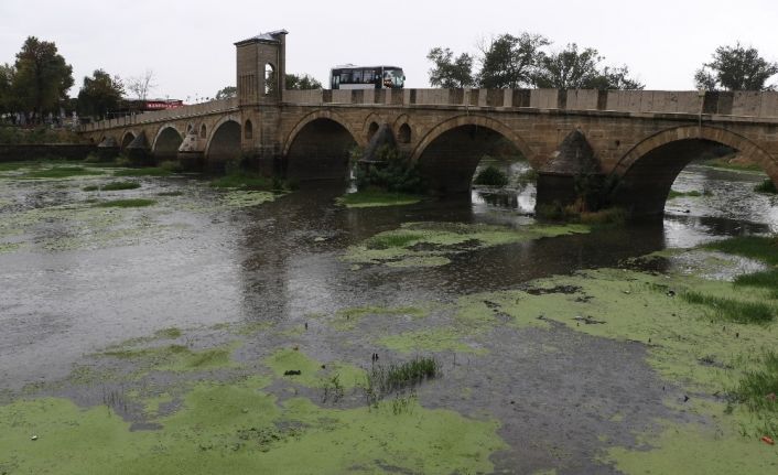 Edirne’de, üzerindeki tarihi taş köprü gerdanlıkları ile kente eşsiz güzellikler katan nehirlerden olan Tunca Nehri, bu kez görüntüsü ile endişe veriyor.