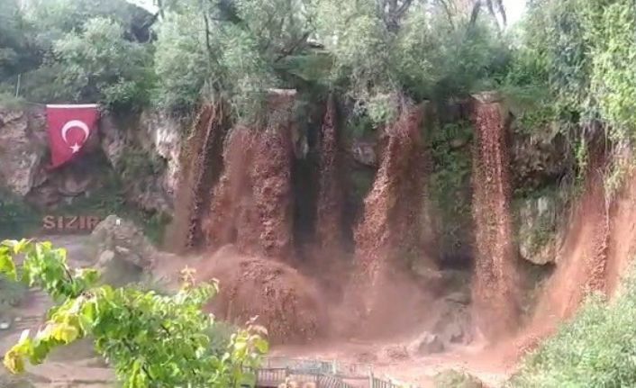 Sivas’ın Gemerek ilçesinde bulunan Sızır Şelalesi, kuvvetli yağışın ardından gelen taşkın sonucunda çamur rengine döndü.