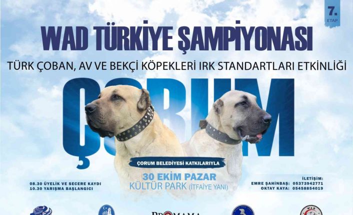 Çorum Belediyesi’nin katkılarıyla Uluslararası Avrasya Köpek Irkları ve Sokak Köpeklerini Koruma Geliştirme Federasyonu (AVKIF) tarafından düzenlenecek WAD Türkiye Şampiyonası’nda köpek ırkları birincilik için yarışacak.