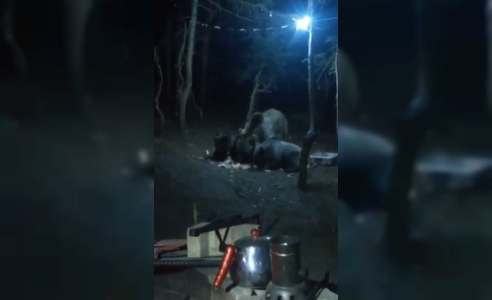 Uludağ’da ormandan yerleşim yeri olarak bilinen Sarıalan Bölgesi’ne gelen anne ayı ve 3 yavrusu; kendileri için bırakılan ekmekleri ve yemekleri yerken görüntülendi. Bir kampçı tarafından görüntülenen ayılar, kaptan su içiyor ve iştahla yemekleri yiyor.