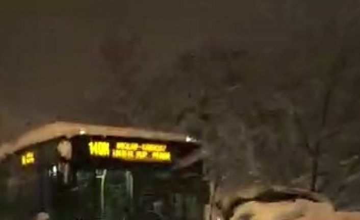 İstanbul’da etkili olan yoğun kar yağışı hayatı olumsuz etkilemeye devam ediyor. Üsküdar’da Libadiye Caddesi üzerinde seyir halinde olan bir İETT otobüsü karla kaplanan yolda ilerleyemeyerek mahsur kaldı. Yolda kalan otobüsü gören bir sürücü ise ilginç bir çözüme imza attı. Otomobilini halat ile İETT otobüsüne bağlayan sürücü, karlı yolda kalan otobüsü çekti. Çevredeki diğer vatandaşlar da otobüsü ittirerek destek vermeye çalıştı. Otomobilin İETT otobüsünü halat ile çektiği anlar vatandaşın cep telefonu kamerasına saniye saniye yansıdı.