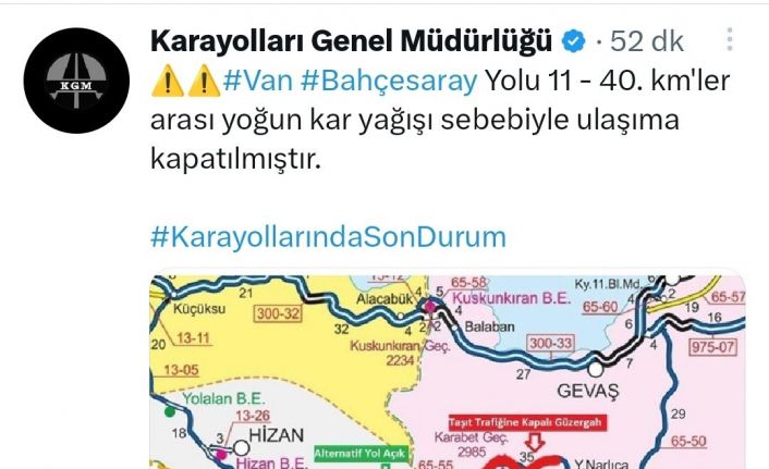 Van-Bahçesaray karayolu yoğun kar yağışı ve çığ tehlikesinden dolayı ulaşımda kapatıldı.
