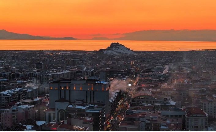 Doğası ve tarihi dokusuyla her mevsim ziyaretçilerini kendine hayran bırakan Van, akşam saatlerindeki gün batımı manzarasıyla kartpostallık görüntüler sundu. Dünyanın en büyük sodalı gölü olan Van Gölü’nün berrak suları üzerinde gün batımı renk skalasıyla seyri doyumsuz manzaralar oluşturdu.