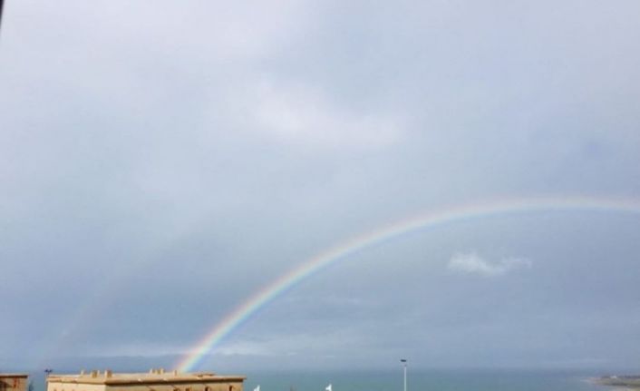Van’ın Edremit ilçesinde yağmurun ardından gökyüzünde oluşan gökkuşağı manzarası görenleri hayran bıraktı.