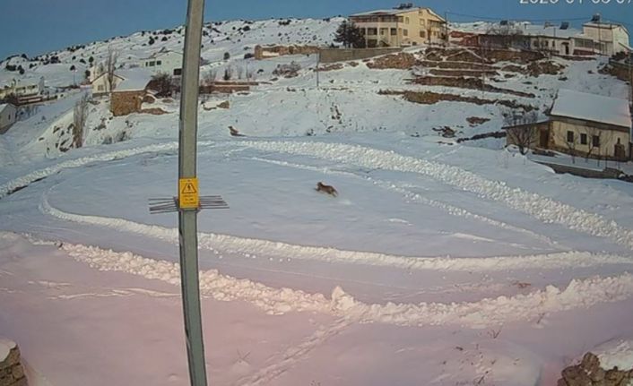 Sivas’ta bir köyde yaban tavşanını avlayan vaşağın bir gün sonra iki kurt tarafından kovalandığı anlar güvenlik kamerasına yansıdı. Belgeselleri aratmayan görüntülerde iki vaşak, kurtlardan kurtulmayı başardı.
