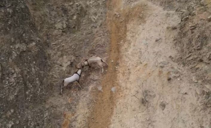 Yaban keçilerinin sarp kayalıklardaki kavgası dronla görüntülendi
