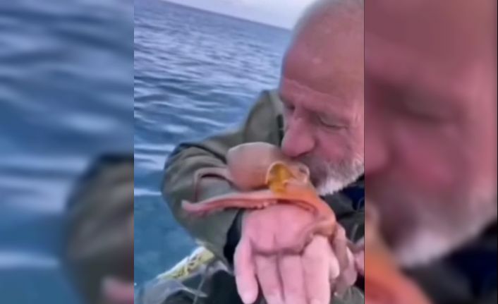 Aydın’ın Didim ilçesinde bir balıkçı, ağına takılan ahtapotu öperek sevdi ve tekrar denize bıraktı.