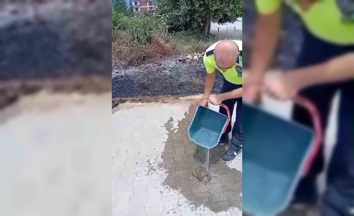 Tokat’ın Erbaa ilçesinde trafik polisleri, yanan otların arasından kurtardıkları kaplumbağayı su ile serinletti. O anlar cep telefonu kamerasıyla kaydedildi.
