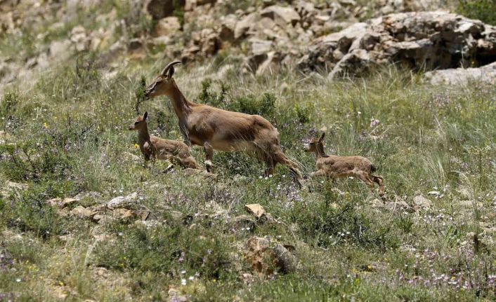Gümüşhane’de kayaların usta tırmanıcıları olan yaban keçilerinin yeni doğan yavrularının sarp kayalıklar üzerindeki oyunları ve Yavru Çengel Boynuzlu Dağ Keçisinin annesinden süt içme anları kameralara yansıdı.