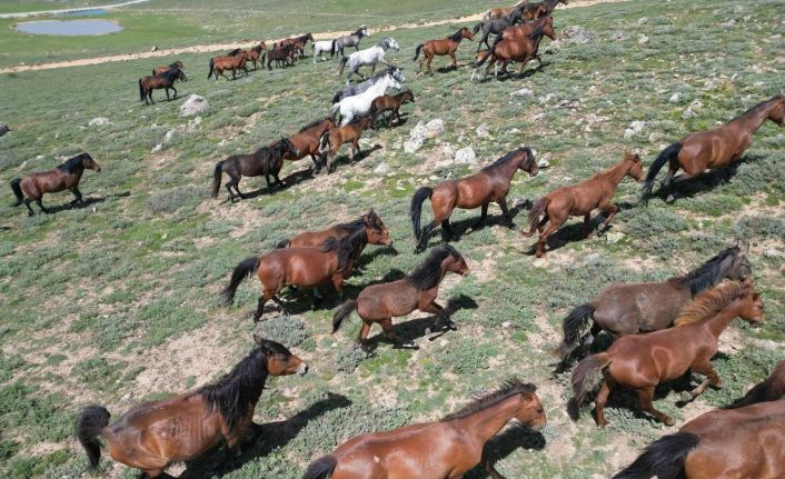 Sevimlilikleri ve ürkeklikleri ile bilinen yılkı atları yaz mevsimin gelmesi ile yaylardan aşağı inmeye başlarken, atların sürülerin halinde gezdiği anlar ise dron kameralarına yansıdı.