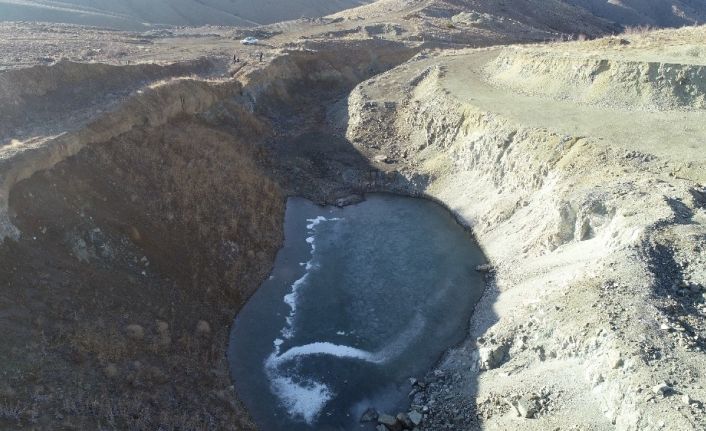 Kış aylarının çetin geçtiği Sivas’ta ocak ayı içerisinde olunmasına rağmen hava sıcaklıkları gündüzleri 5 dereceyi buluyor. Gürün ilçesine bağlı Sarıca köyünde de gündüzleri yaz havası yaşanırken, geceleri ise termometreler sıfırın altında 10 dereceyi gösteriyor. Köy yakınlarında eski krom madeni sahasında bulunan gölet gece etkisini gösteren soğuk havanın etkisiyle buzla kaplandı. Madenin kapanmasıyla birlikte oluşan gölette yaklaşık 10 santimetre kalınlığında buz tabakası oluştu. Bölgede bulunan vatandaşlar göletin üzerine taş atarak kırılıp kırılmadığını test etti. Vatandaşlardan birisi ise buz tutan göletin üzerine çıkarak fotoğraf çektirdi.