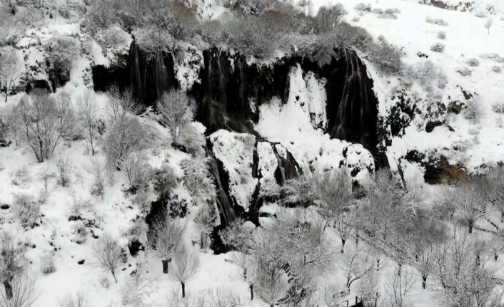Erzincan’da doğal güzelliğiyle öne çıkan ve son günlerde etkili olan kar yağışıyla beyaza bürünen Girlevik Şelalesi, ziyaretçilerini cezbediyor.