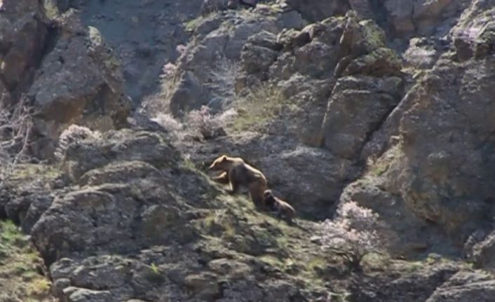 Sivas’ın Divriği ilçesinde yiyecek aramak için köy yakınlarına kadar inen anne ayı ve 2 yavrusu cep telefonuyla görüntülendi. Hayvan sever vatandaşlar tarafından görüntülenen ayı ailesi, bir süre yiyecek aradıktan sonra gözden kayboldu. Bilinçsiz avcılar dolayısı ile ailenin görüldüğü yer ise gizli tutuluyor.
