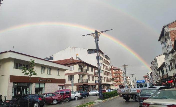 Yozgat’ta akşam saatlerinde yağmur sırasında gökyüzünde beliren gökkuşağı, izleyenlere görsel şölen sundu.