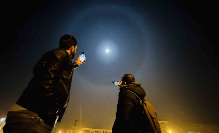 Hakkari’nin Yüksekova ilçesinde ayın etrafında nadir görülen hale oluştu. Vatandaşlar telefonlarına sarılarak o anları kayıt altına aldı.