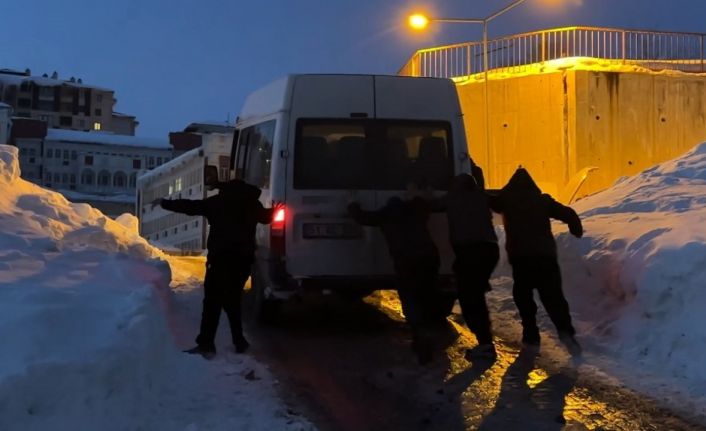 Esenyurt Mahallesi’ndeki yokuşu çıkmaya çalışan minibüs, zemindeki aşırı buzlanma nedeniyle yolda mahsur kaldı. Aracın ilerleyemediğini gören mahalle sakinleri, kısa sürede bir araya gelerek sürücüye yardım etmek için seferber oldu. Vatandaşların yaklaşık 2 saat süren zorlu çalışması ve el birliğiyle itilmesi sonucu minibüs, mahsur kaldığı buzlu alandan kurtarıldı.