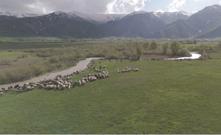 Hakkari’nin Yüksekova ilçesinde karların erimesinin ardından yeşile bürünen ovalar ve otlayan hayvanlar dron ile görüntüledi.