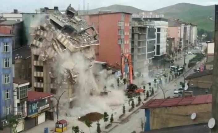 HAKKARİ (İHA) – Hakkari’nin Yüksekova ilçesinde kentsel dönüşüm projesi çerçevesinde bir bina yıktırılırken, yayılan toz bulutu ise caddeyi kapladı.
