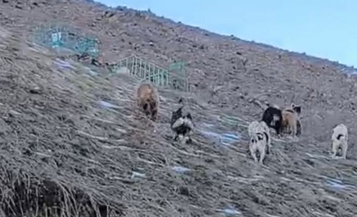 Hakkari’nin Yüksekova ilçesinde yerleşim yerine inen ayıları çoban köpekleri uzaklaştırdı.