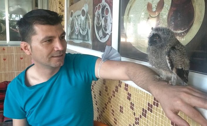 Adıyaman’ın Gölbaşı ilçesinde yuvasından düşen kulaklı orman baykuşu yavrusunu bulan esnaf, yavru baykuşa çocuğu gibi bakıyor.