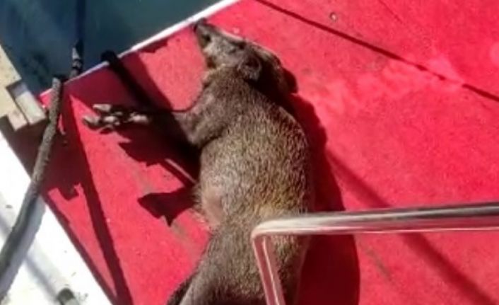 Tekne sahipleri tarafından denizden çıkarılan domuz, daha sonra tedavi edilmek üzere belediye ekiplerine teslim edildi.