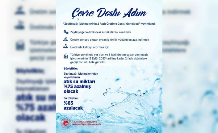 Çevre, Şehircilik ve İklim Değişikliği Bakanlığı tarafından, zeytinyağı işletmelerinin çevreye olumsuz etkilerinin en aza indirilmesi, su kirliliğin önlenmesi ve su tüketiminin azaltılması amacıyla "Zeytinyağı İşletmelerinin 2 Fazlı Üretime Geçişi Genelgesi" yayımlandı. Genelgeye göre atık su miktarlarının ve kirlilik yüklerinin düşürülmesi amacıyla zeytinyağı işletmelerinin 3 fazlı üretimi sonucunda oluşan atık su miktarları ve kirlilik yükleri düşürülecek. Türkiye genelinde yer alan ve 3 fazlı üretim yapan zeytinyağı işletmelerinin 15 Eylül’e kadar 2 fazlı sisteme geçmesi zorunlu olacak.