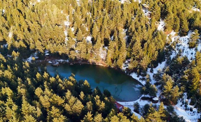 Beyaz ve yeşilin iç içe geçtiği görsel şölen çevresindeki çam ormanlarının ve zirvelerin karla kaplanmasıyla masalsı bir atmosfere dönüştü.