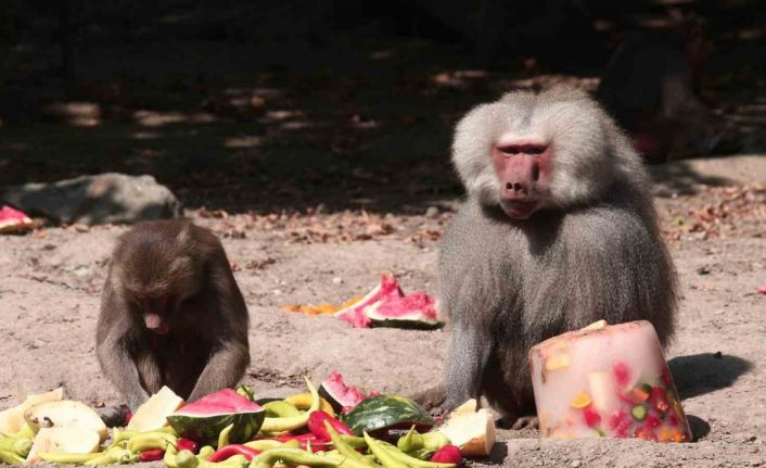 Bursa Büyükşehir Belediyesi Hayvanat Bahçesi’nde hayvanlar Afrika sıcaklarında buzlu meyve ve sebzelerle serinliyor.