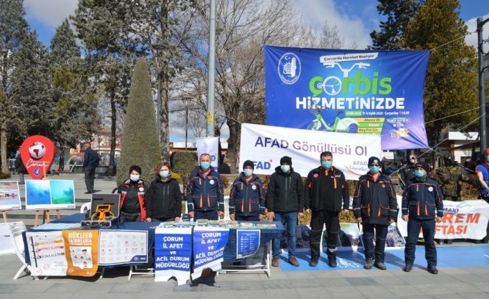 Çorum İl Afet ve Acil Durum Müdürlüğü, Deprem Haftası etkinlikleri kapsamında farkındalık standı açarak araç ve malzemelerini tanıtırken vatandaşlara da afetler hakkında bilgiler verdi.
