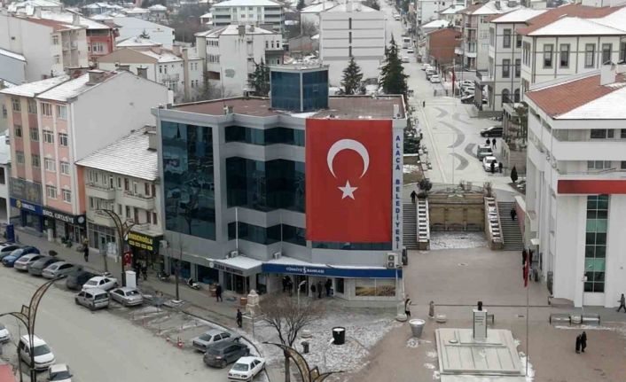 Alaca Belediyesi, Nusaybin-Kamışlı sınır hattında Türk bayrağına yönelik gerçekleştirilen saldırıyı hizmet binasına asılan dev Türk bayrağıyla kınadı.