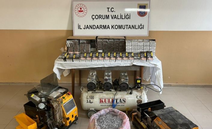 Çorum’un Alaca ilçesinde jandarma ekipleri tarafından yasa dışı sigara imalatı yapıldığı belirlenen adreste yapılan aramda on binlerce makaron ve çok sayıda tütün sarma makinesi ele geçirildi.