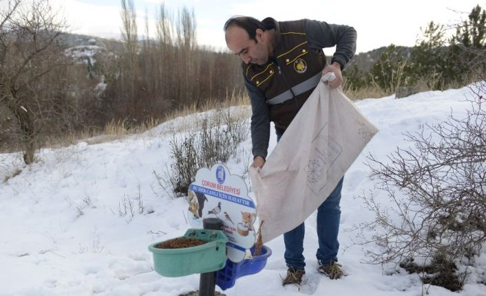 Çorum Belediyesi, soğuk kış günlerinde sokak hayvanlarını ve yabani hayvanları için doğaya düzenli olarak yem bırakıyor.