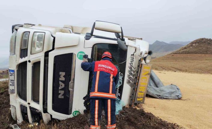 Çorum’un Sungurlu ilçesinde virajı alamayarak devrilen tırın sürücüsü yaralandı.