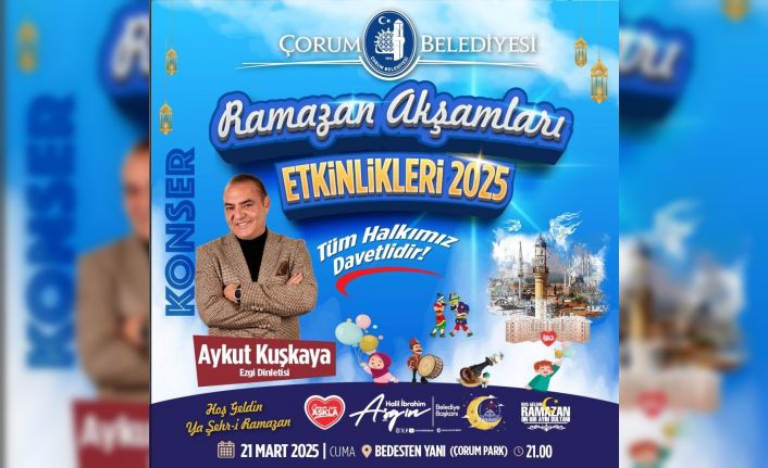 Ramazan ayının son haftalarına yaklaşırken Çorum Belediyesi hız kesmeden programlara devam ediyor. Geleneksel hale gelen "Ramazan Akşamları" programı, bu sene de dolu dolu içeriğiyle, 21 Mart Cuma akşamı saat 21.00’de Çorumpark’da Sanatçı Aykut Kuşkaya kendisine has üslubuyla güzel bir konser verecek. 22 Mart Cumartesi akşamı ise Prof. Dr. Mehmet Emin Ay ve Doç. Dr. Mustafa Demirci’nin seslendireceği ilahi ve tasavvuf eserleriyle halkın karşısına çıkacak.