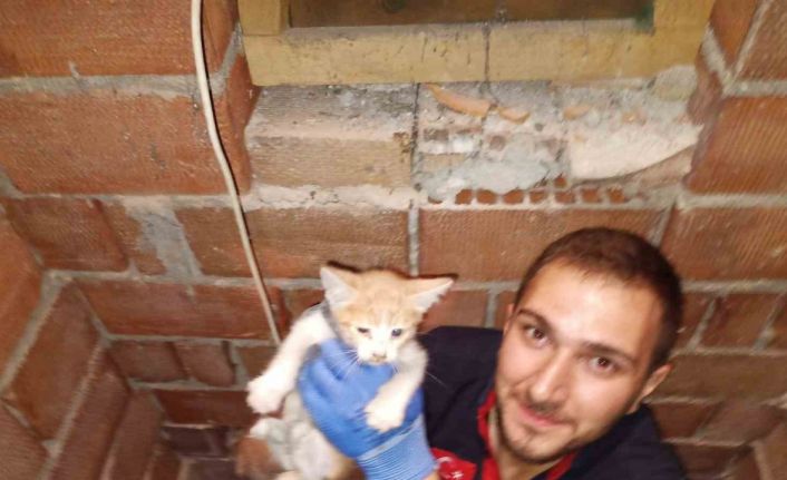 Çorum’un Bayat ilçesinde bir apartmanın havalandırma boşluğuna düşen yavru kedi, itfaiye ekipleri tarafından kurtarıldı.