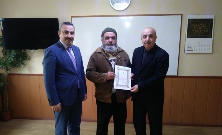 Osmancık İlçe Müftüsü Dr. Eyyup Aydın, Türkiye Diyanet Vakfı Genel Merkezi’nce gönderilen teşekkür belgesini arsasını bağışlayan Tunca’ya taktim etti.