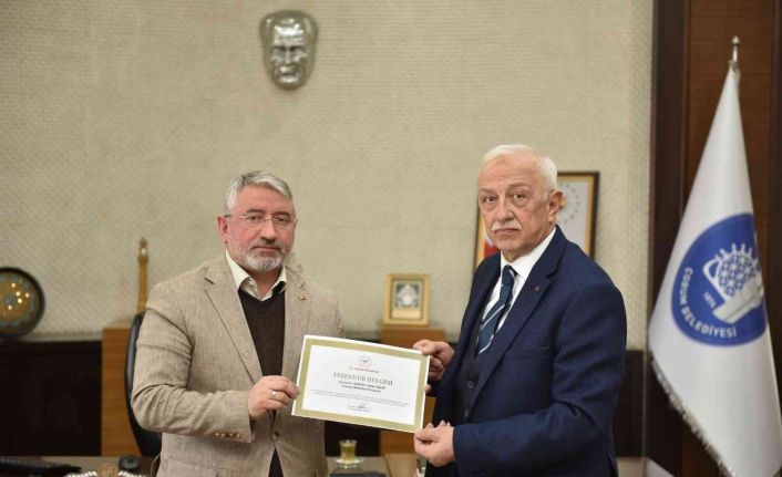 İl Sağlık Müdürü Uzm. Dr. Ömer Sobacı, 14 aydır devam eden filyasyon desteği nedeniyle Belediye Başkanı Dr. Halil İbrahim Aşgın’a teşekkür belgesi takdim etti.