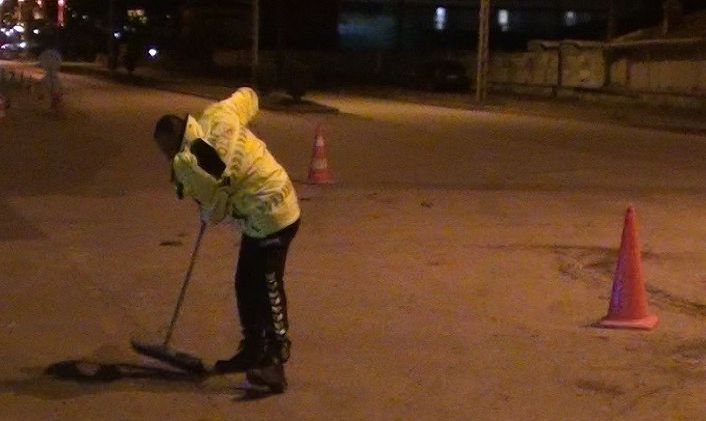 Polisler, diğer sürücülerin can ve mal kaybına neden olabileceği ihtimalini düşünerek kaza sonrası yola dökülen cam kırıklarını, ellerine aldıkları süpürge ile temizlediler.