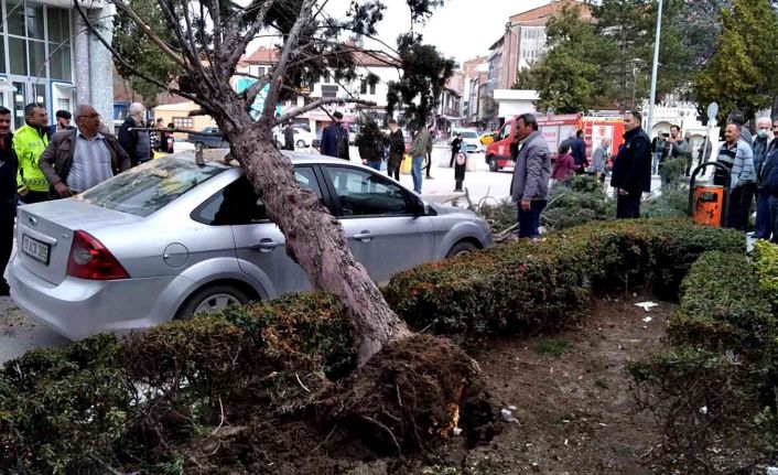 Çorum’da şiddetli rüzgar nedeniyle kökünden sökülen ağaç park halindeki otomobilin üzerine devrildi.