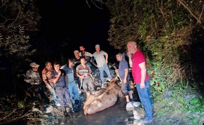 Olay, ilçeye bağlı Elmalı köyünde meydana geldi. Edinilen bilgiye göre, Şükrü Kaya’ya ait inek araziden dönerken ayağının kayması neticesinde köprüden dereye düştü. İneği kurtarmak için çalışan köy sakinleri, çabalarında başarılı olamayınca 112 Acil Çağrı Merkezini arayarak istedi.