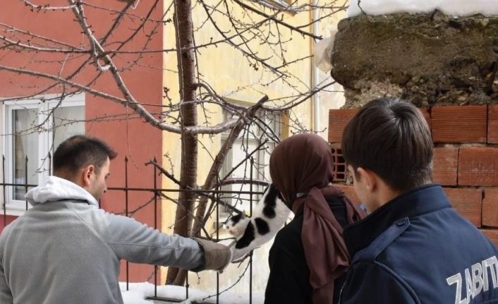 Çorum’un İskilip ilçesinde demir korkuluklara saplanan kediyi belediye ekipleri kurtardı.