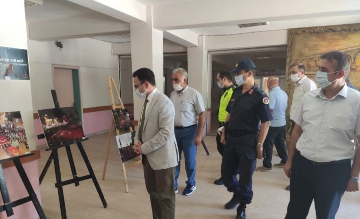 Kaymakamlık binası giriş koridorunda açılan sergide, Fetullahçı Terör Örgütü’nün (FETÖ) darbe girişiminin ardından çekilen fotoğraflar yeraldı.