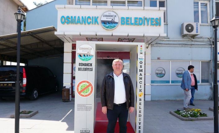 Çorum’un Osmancık ilçesinde yeni tip Koronavirüsle (Covid-19) mücadele kapsamında belediye binası girişine "dezenfeksiyon tüneli" konuldu. Belediye başkanı Ahmet Gelgör ve başkan yardımcısı Kadir Eskiadam, dezenfeksiyon tünelinden geçerek test etti.