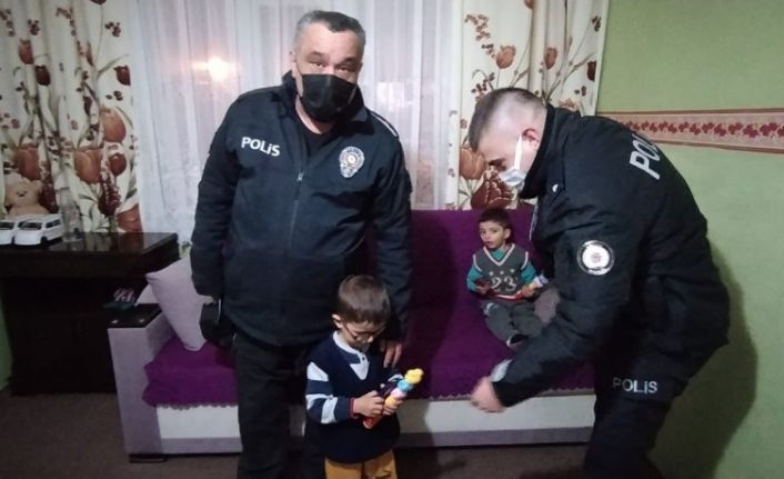 Çorum’un Sungurlu ilçesinde polisler pandemi nedeniyle evlerinden çıkamayan çocuklara hediyeler götürdü.