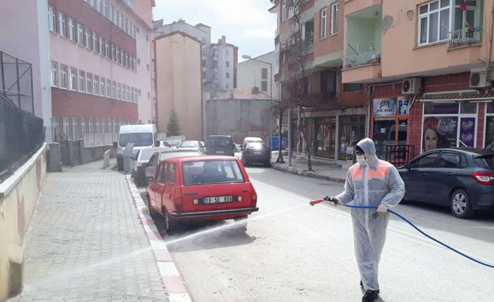 Çorum’un Sungurlu ilçesinde kaldırımlar belediye ekiplerince koronovirüs tedbirleri kapsamında dezenfekte ediliyor.