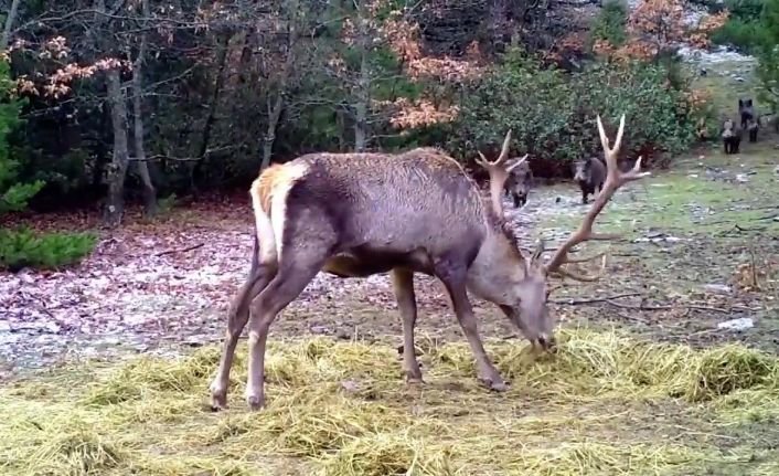 Denizli’de halen karla kaplı Karcı Dağı’na bırakılan yemlerle karnını doyuran kızıl geyik, aç kalan domuz sürüsünün tacizi sonucu yemeğini yarıda bırakarak kaçmak zorunda kaldı.