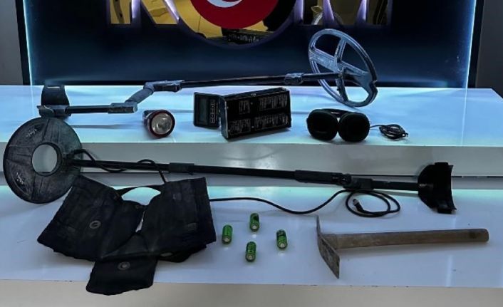 Denizli’de ellerinde dedektörle arazide günlerce define arayan 2 şüpheli, yanlarında bulunan malzemelerle yakalandı.