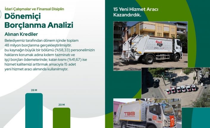 Başkan Dere, 2024-2025 döneminde belediye tarafından toplam 48 milyon TL kredi kullanıldığını ifade ederek, bu borçlanmanın detaylarını da paylaştı. Kullanılan kredinin yüzde 58,33’lük kısmının (28 milyon TL) personel haklarını korumak amacıyla kıdem tazminatları ve işçi alacaklarının ödenmesinde kullanıldığını belirtti. Kalan yüzde 41,67’lik bölümün ise (20 milyon TL) belediyenin hizmet kapasitesini artırmak amacıyla alınan 15 adet hizmet aracının finansmanında değerlendirildiğini söyledi.